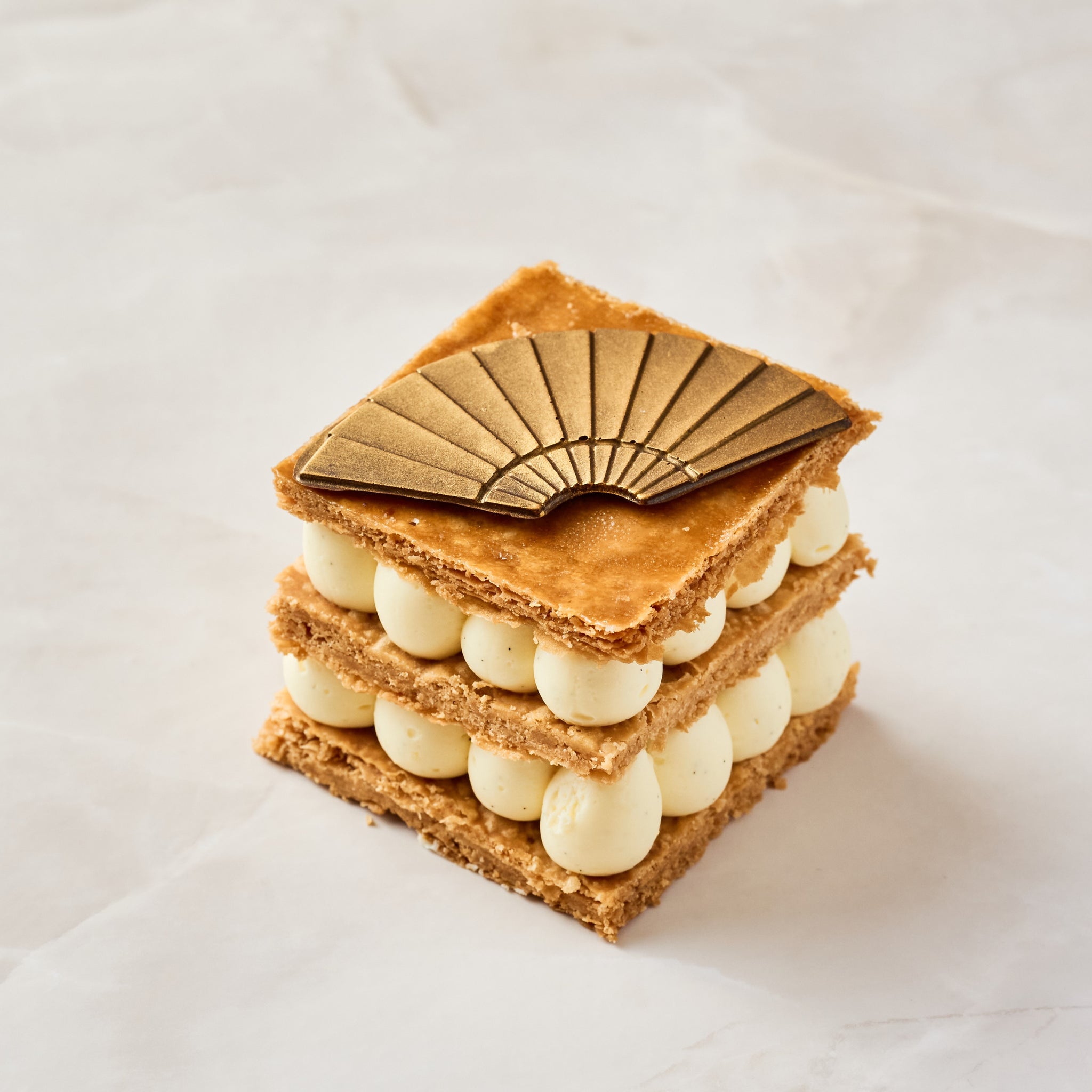 Crisp and caramelized puff pastry layered with smooth vanilla diplomat cream and a rich touch of golden caramel.