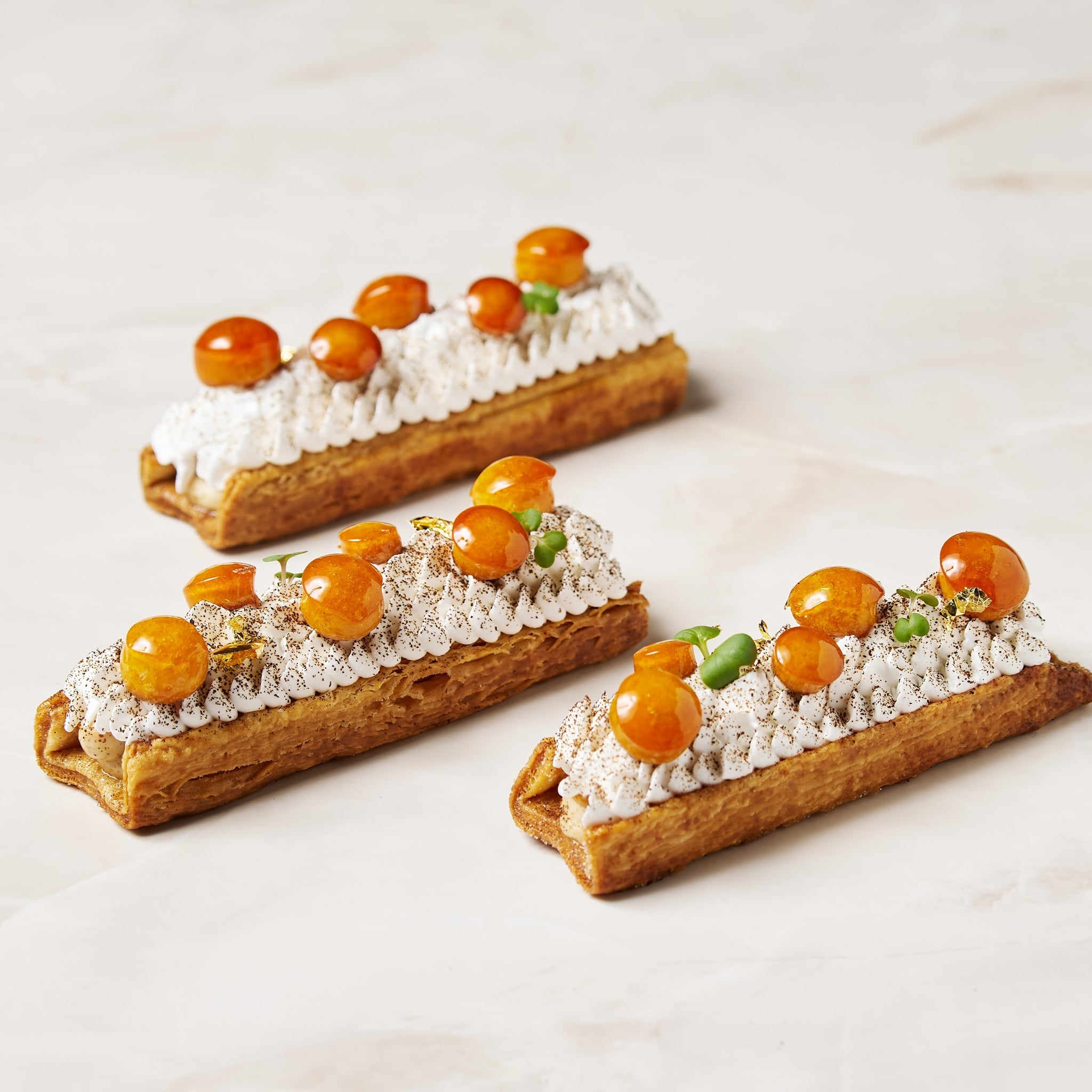 Rich pecan praline, silky pecan cream, and crowned with delicate gold-caramel choux.